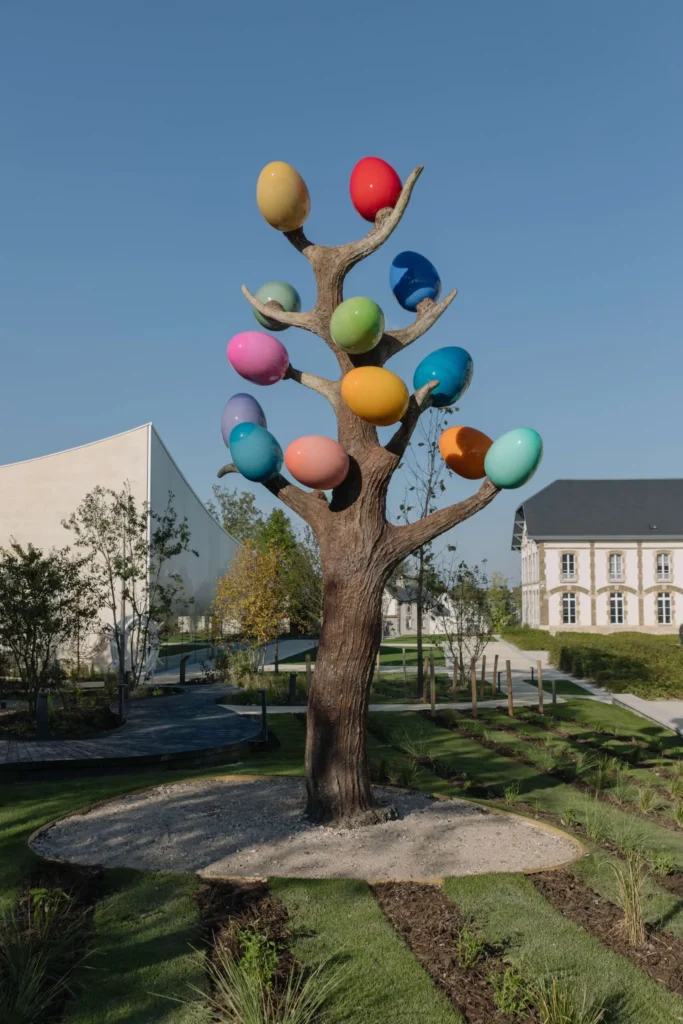 L’édifice, situé face aux bâtiments historiques de la cour d’honneur de la Maison Ruinart, a ainsi été pensé comme un espace pour célébrer la culture et l’art de vivre. À l’intérieur, les visiteurs peuvent flâner dans une élégante boutique, déguster des champagnes dans un bar raffiné, ou encore explorer une cave secrète où sont conservées des cuvées millésimées rares. À l’extérieur, les jardins accueillent une vingtaine d’œuvres d’art contemporain, réalisées spécifiquement pour Ruinart. Le tout est en accès libre, offrant une expérience culturelle complète et unique aux visiteurs.