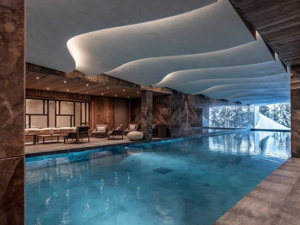 Au-delà du design, Antarès propose une expérience calibrée autour du bien-être, élément devenu central dans les nouvelles formes de luxe alpestre. Son spa, l’un des plus complets des Trois Vallées, adopte une vision holistique qui dépasse le traditionnel après-ski. Bassins, hammams, cabines de soins, salles dédiées à la récupération sportive : chaque équipement traduit une compréhension fine des besoins du corps en altitude. Le wellness n’est pas présenté comme un supplément, mais comme une composante naturelle du séjour, un rituel quotidien au même titre que la glisse ou le repos. On y retrouve cette idée d’un luxe qui se mesure moins à l’apparat qu’à la qualité du ressourcement.