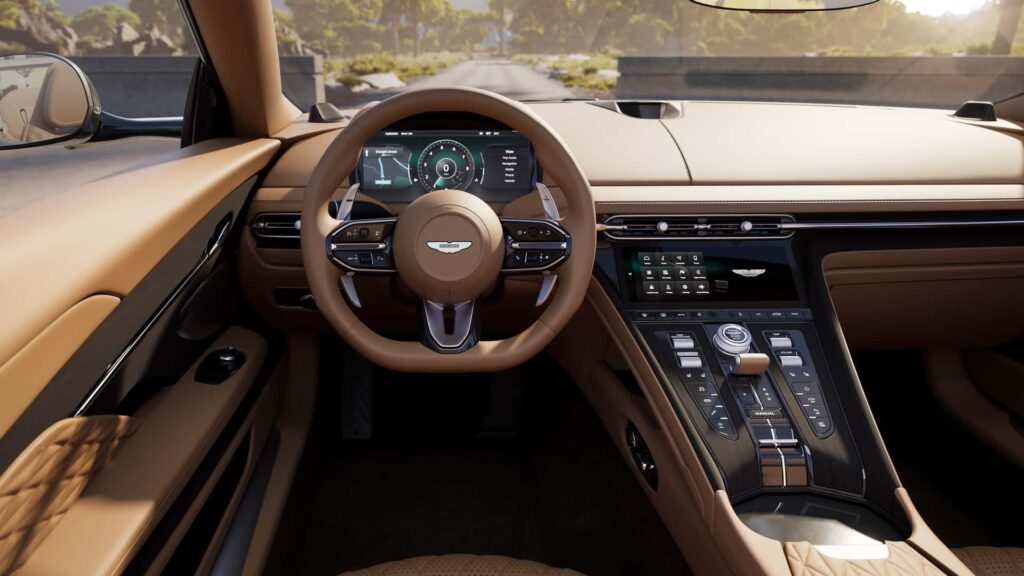 À l’intérieur de la DB12 Volante, l’élégance est une constante, en harmonie avec le pedigree d’Aston Martin. Les maîtres artisans de la marque ont créé une sellerie d’une sophistication inégalée, entièrement personnalisable grâce au programme exclusif Q by Aston Martin. Cette union de tradition et d’innovation s’étend également au système d’infodivertissement, conçu en interne et mettant de côté les emprunts à Mercedes. Le cœur de ce système réside dans un écran tactile de 10,25 pouces, permettant de régler la climatisation, les paramètres du véhicule et les modes de conduite, entre autres fonctionnalités.