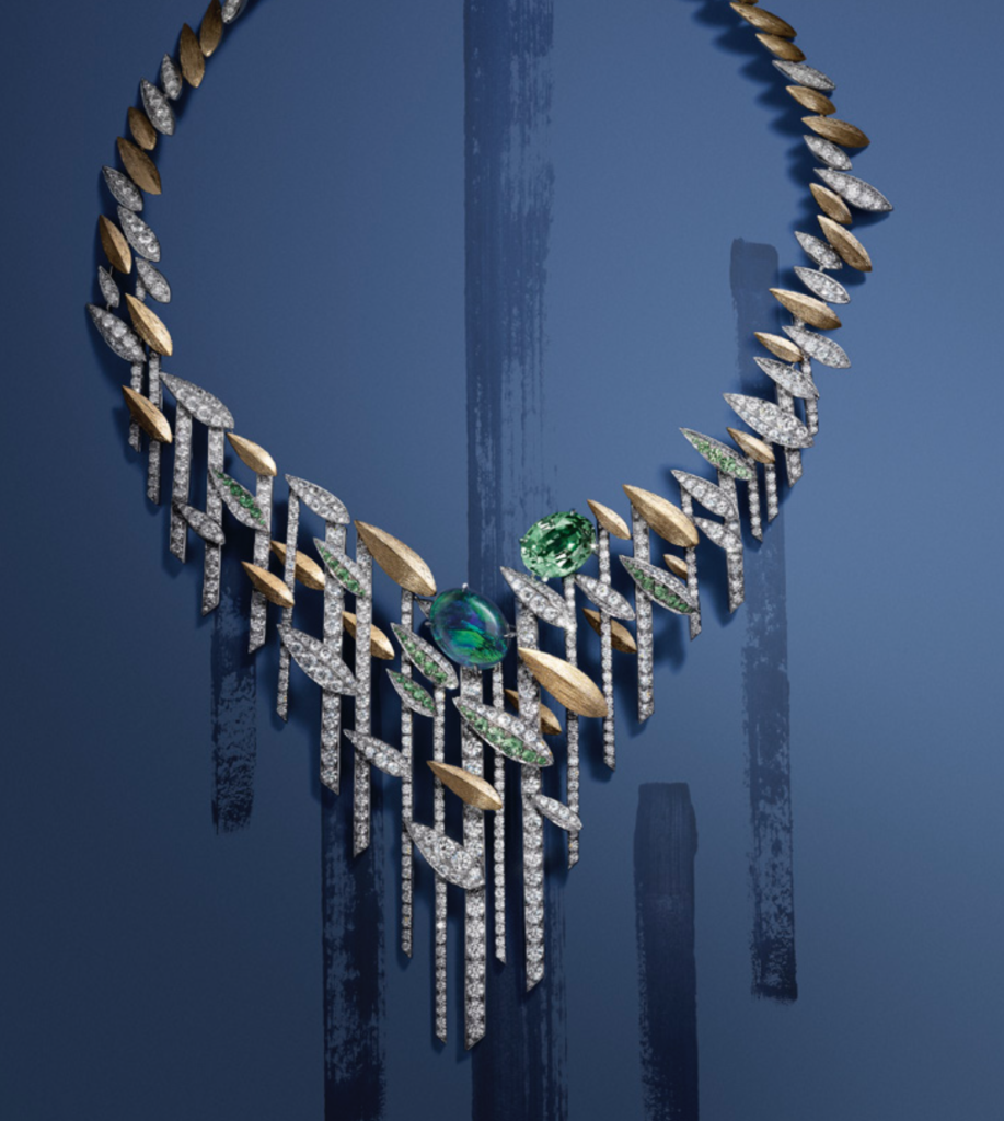 Pièce maîtresse de la collection, le collier plastron magnifie ce dialogue en intégrant une somptueuse opale noire d’Australie de 13,19 carats. Ses reflets bleus et verts, mystérieux et profonds, trouvent un écho parfait dans l’éclat verdoyant des grenats tsavorites, capturant ainsi la lumière avec une intensité inédite. Porté au creux du cou, ce bijou incarne une modernité sculpturale, fidèle à l’esprit avant-gardiste de Chaumet.