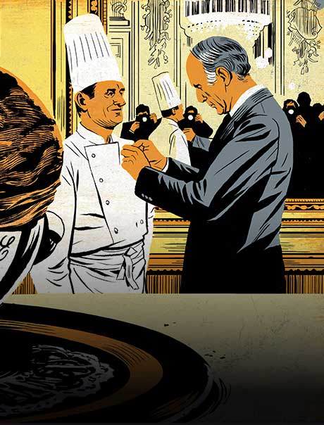 En 1958, année de la reprise de l’auberge familiale, il reçoit sa première étoile au Guide Michelin. En 1961, il est honoré du titre de Meilleur Ouvrier de France. En 1962, c’est la seconde étoile. En 1965, il est le premier Chef de l’histoire à recevoir les 3 étoiles du Michelin — un graal tant convoité ! Ce fut alors le début d’une myriade de récompenses venant célébrer sa vision fraîche, légère et la clarté des saveurs que sa cuisine laisse éclater.