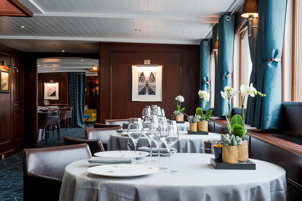 L’atmosphère à bord joue la carte du raffinement feutré : boiseries nobles, moquettes épaisses, fauteuils enveloppants, lumière tamisée. Seulement douze tables, savamment espacées, pour que le murmure de la conversation se mêle au clapotis du fleuve. À travers les baies vitrées, la ville se déploie comme un film silencieux : pont Alexandre III, dôme doré des Invalides, arches de Notre-Dame, silhouettes des péniches endormies… Chaque virage révèle une nouvelle composition.