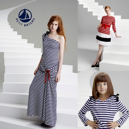 Ideal for wearing day or night. Opera and the couturier may smack of glamour, but Petit Bateau is the master of casual. For their 120th birthday, this encounter has culminated in anti-conceptional creations where basics come into contact with velvet ribbons in luminous colors like coral, gold, purple, or black, all of which raise the ante for the nautical stripes. Without damaging its childish roots, Petit Bateau is evoking surprise and desire with a little help from one of fashion’s mainstay personalities. Christian Lacroix designed 6 pieces altogether, two of which were made for little girls. Amongst them, an admirable evening dress with blue and white stripes, topped off by little red bows and bare shoulders. This short and sweet story comes to life on the incandescent comédienne Agathe Bonitzer, a former classical dancer. In stores on December 6th, the pieces will be available in Petit Bateau boutiques as well as the Opéra de Paris’ official boutique.