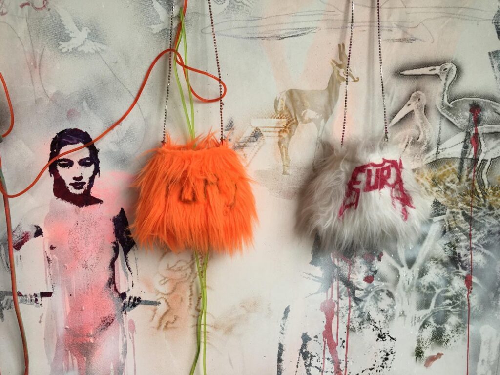 Indeed, Fury expresses herself through a palette of vivid colors and patterns that break with monotony, employing fluorescent pink, electric blue, and textures that invite touch and reflection.