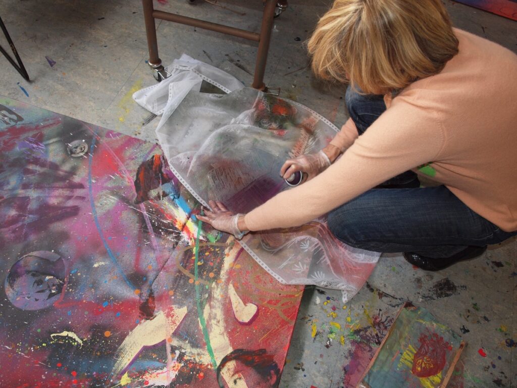 Among her most striking works are her bold paintings like “50 Shades of Red,” inspired by tragic events such as the Bataclan, demonstrating an intuitive ability to capture the essence of contemporary dramas before they unfold.