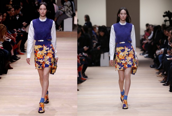 “We wanted to imagine what foreigners must think of the Parisienne, her elegance, her urban attitude, a certain nonchalance…” This first collection distills retro and pure silhouettes in the cut; made ravishing and enrapturing with floral prints, at times hippy, sometimes naive, but always playful. In a color palette that goes from lavender to red with midnight blue in between, Adrien Caillaudaud and Alexis Martial are taking on Winter to make it a season of possibilities. With semi-transparent blouses, high-waisted tight pants, and shoes filled with character, the Carven girl only dreams of style.