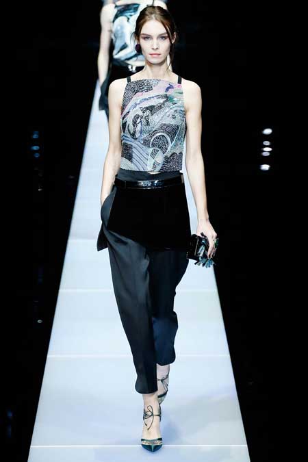Dark, Klein, light, or iridescent, blue seems to be the key component of Armani’s runway show. A show where the refinement seems to be directly inspired by the 40s. In those days, Giorgio Armani was a child who, to escape the torment of a world at war, preferred to hide in the shadows of movie theaters. This is no doubt the backdrop for a wide array of his creations; today, Armani is unleashing a woman dressed up in fur, bows, and ruffles, but in a sleek male-female way. This is how Armani designed next winter with soft elegance for their ready-to-wear line Emporio. And this winter, the keystone piece is none other than men’s trousers.