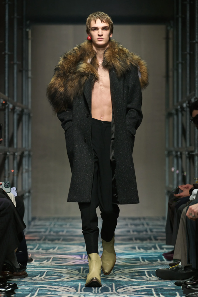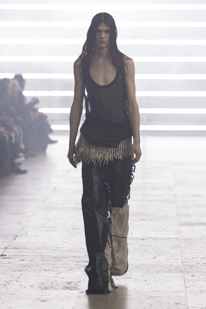 Dans l’univers de Rick Owens, chaque collection est une performance. Cette saison, il a poussé encore plus loin son exploration des volumes, avec des manteaux aux épaules exagérées et des capes drapées dans un tissu quasi architectural. Les silhouettes longilignes, les bottes gladiateur revisitées, tout semble dessiner une figure masculine héroïque, presque antique.