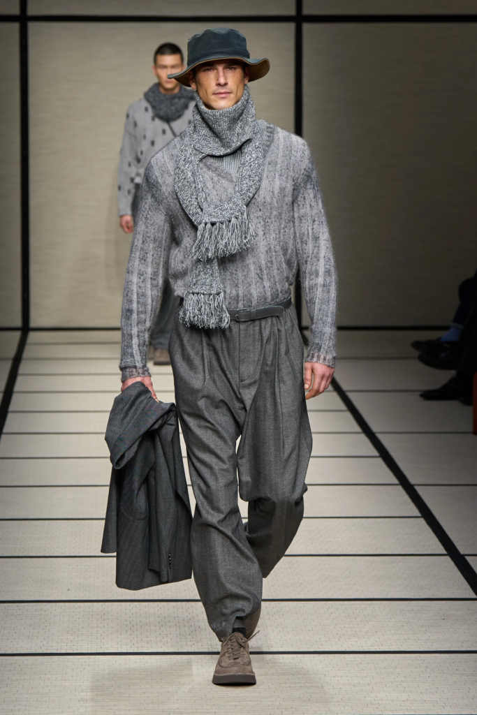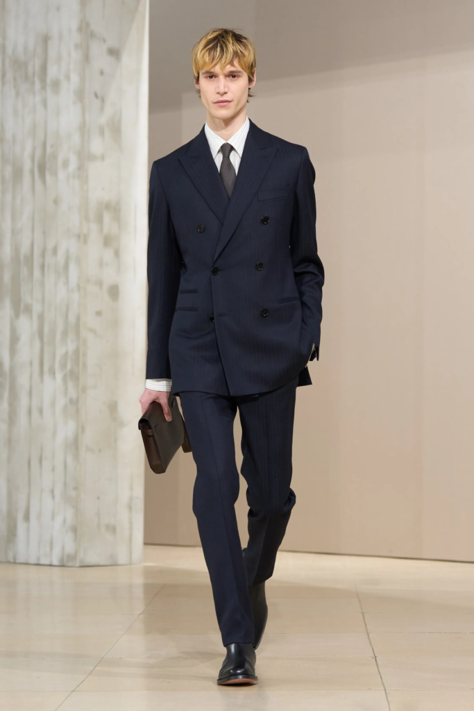 Armani est le maître incontesté d’un vestiaire fluide et sophistiqué, et cette collection en est une preuve magistrale. Les costumes se déclinent en textures riches et en coupes d’une précision chirurgicale. On note une attention particulière portée aux épaules, qui structurent la silhouette sans rigidité. La palette de couleurs reste fidèle aux tons naturels chers à la maison : taupe, gris perle, marine profond. Une élégance en apesanteur.