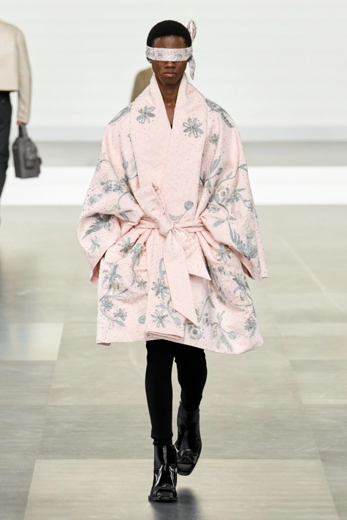 Kim Jones a une fois de plus prouvé qu’il maîtrise l’art de transposer les codes de la couture féminine au vestiaire masculin. Cette saison, il puise directement dans les archives de Christian Dior, notamment la collection haute couture de 1954. Le tailoring est sculptural, avec des vestes ceinturées et des pantalons aux volumes légèrement évasés, évoquant une silhouette presque aristocratique. Les matières nobles – velours, laine double face, soie duchesse – rappellent la sophistication extrême du travail de la maison, tandis que les broderies délicates sur les chemises et manteaux imposent une nouvelle vision du luxe masculin.