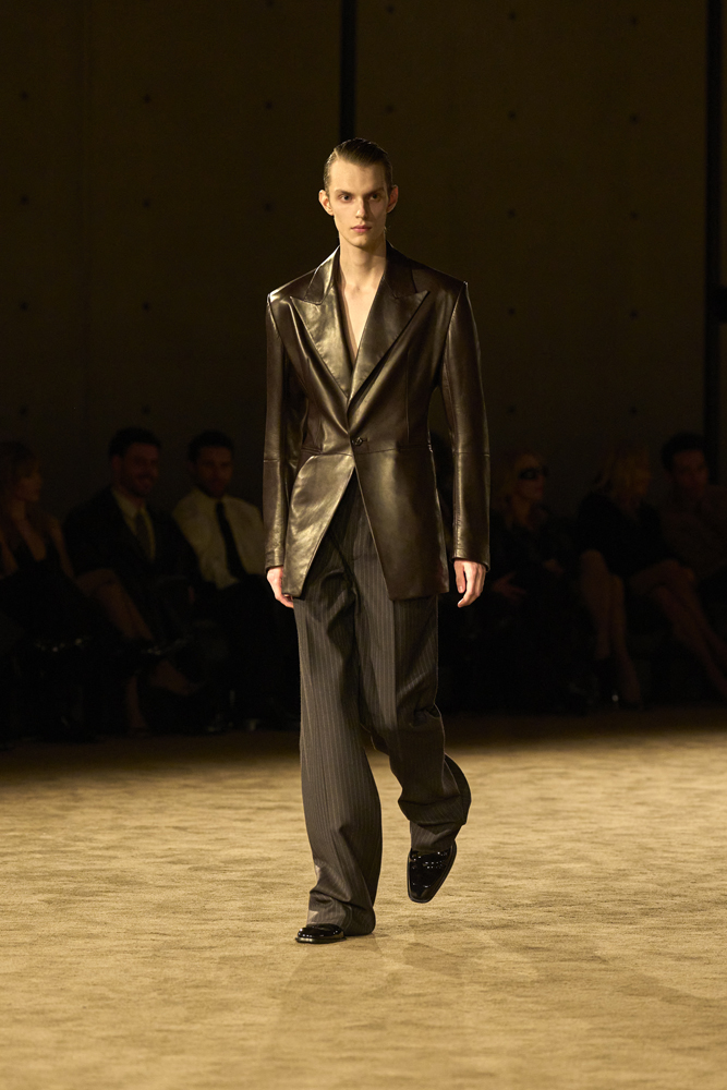 Présenté en marge du calendrier officiel, le défilé Saint Laurent n’en reste pas moins l’un des moments marquants de la semaine. Anthony Vaccarello poursuit son exploration du costume comme objet de désir et de tension. Inspirée par une esthétique presque cinématographique, la collection revisite les codes historiques de la maison, noir profond, lignes nettes, sensualité contenue, en y injectant des matières brillantes et des détails fétichistes. Le tailoring devient narratif, chargé d’une élégance mentale, où chaque silhouette semble raconter une histoire plus intime que démonstrative.