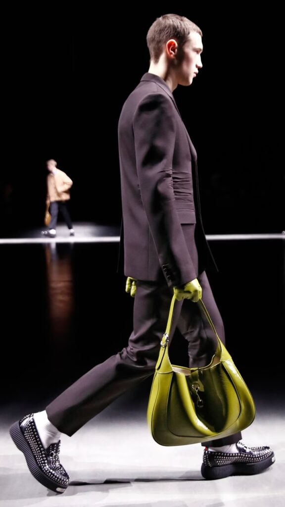 Pour son premier défilé homme chez Gucci, Sabato De Sarno est resté fidèle à sa vision — simple, élégante, fluide et défiant irrévérencieusement les conventions du tailoring. A noter surtout, les sacs Jackie agrandis avec des bretelles extensibles, directement inspirés du modèle iconique porté par Samuel Beckett lors de ses voyages en Italie !