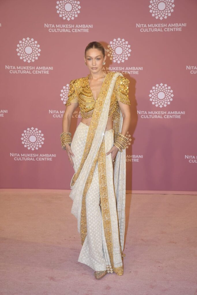 Il ne s’agit nullement d’un poisson d’avril. Gigi Hadid, la mannequin de renom, a fait une apparition remarquable sur le tapis rouge lors du lancement du Centre Culturel Nita Mukesh Ambani, le samedi 1er avril. Elle était revêtue d’un ensemble signé Abu Jani Sandeep Khosla qui rappelait une version contemporaine de Devdas, sa prestance n’a laissé personne indifférent. Le look adopté était d’un ivoire immaculé, orné de joyaux et de broderies dorées sur le haut. Elle a complété celui-ci, avec une profusion de bracelets en or aux poignets, ainsi qu’avec des diamants qui sublimaient ses oreilles.
