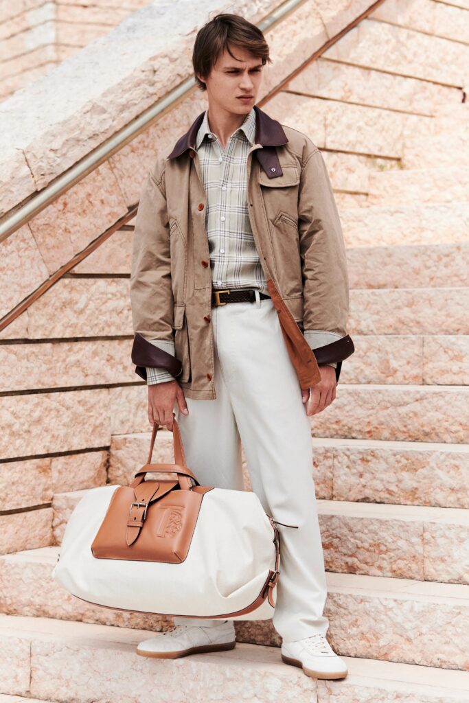 On note encore l’apparition d’une veste inédite, dite Jack Biker. Une veste en toile où les coussinets en cuir Gommino – le motif signature de la maison – viennent se poser comme des patchs sur les coudes.