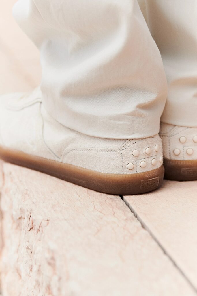 Ces picots que l’on retrouve aussi sur une paire de sneakers immaculée, et estampillée du nom Tod’s. Les picots du Gommino venant se piquer à l’arrière de la basket !