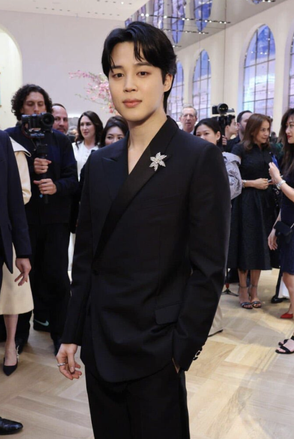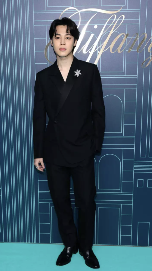 Jimin est arrivé dans une veste de costume asymétrique à la mode et un pantalon, choisissant de laisser sa poitrine exposée sous la veste. Jimin portait une seule broche accrocheuse et deux bagues, gardant son look simple.