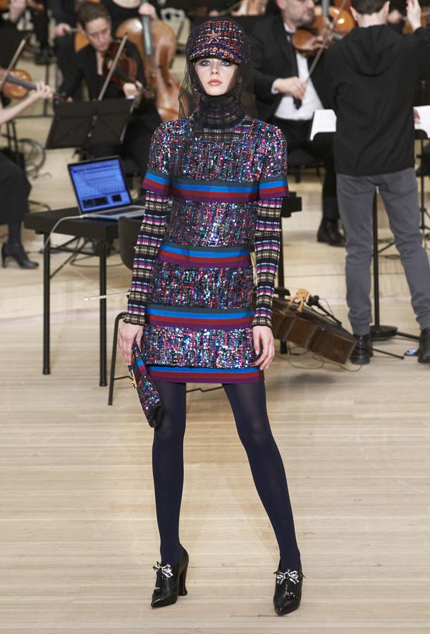 Cette fois à Moscou, c’est Chanel qui introduit sa broderie, à présent aux mains des ateliers Montex. Du volume engendré par la technique de crochet de Lunéville, ainsi que des machines Cornely, naissent ici des motifs en trois dimensions. « C’est fait d’une façon très artisanale dans le meilleur sens du mot, parce que dans artisanal, il y a art. L’art de bien faire. Un art appliqué » souligne Karl Lagerfeld. Et il est vrai que les géométriques et l’asymétrie de cette robe du soir distillent dans les riches broderies tout de l’austère raffinement de la maison Chanel !