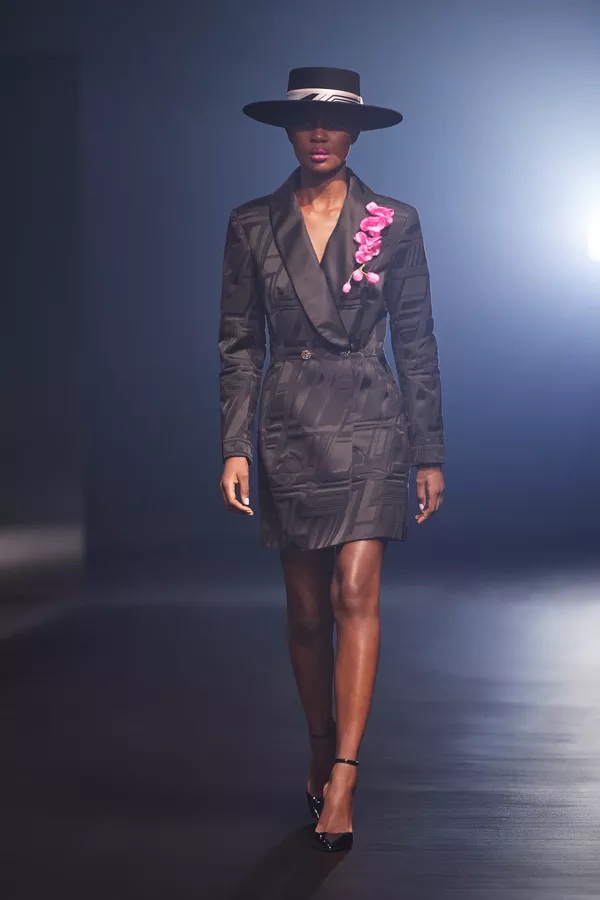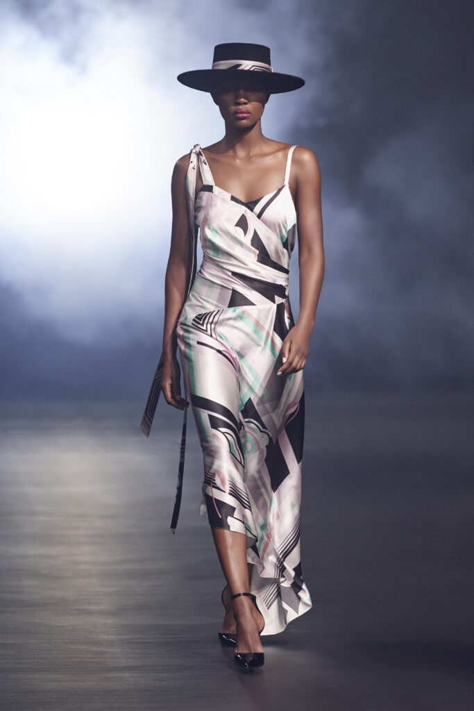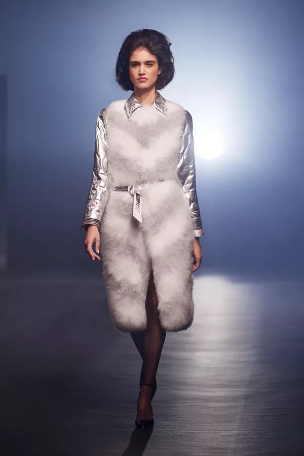 Et il est vrai que les pièces de l’Automne/Hiver 2021 révèlent une savante opulence. Pièce phare de la collection, c’est le manteau à motif de chevrons en cuir argenté, orné de plumes de marabout grises et blanches, et doublé de l’imprimé géométrique de la saison, qui laisse l’oeil et les sens redonner vie à la notion de glamour.