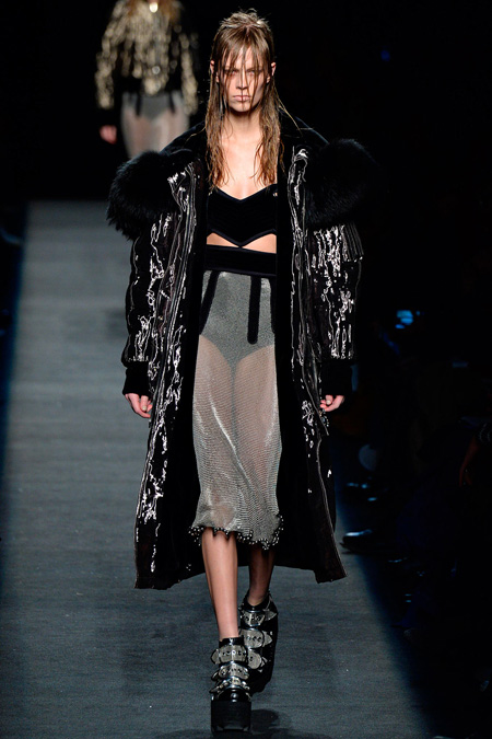 Et ce néo-punk s’incarne dans une jupe médiévale à la transparence en treillis de métal. Une jupe en maille donc, alourdie d’une chaîne à l’ourlet – et ceci ne peut que subjuguer une longueur au tombée parfait. La transparence est efficace, le style tellement novateur. Voici simplement que l’élégance brute d’Alexander Wang se déploie vers des sentiers inconnus, esquissant rapidement la silhouette d’un nouveau romantisme.