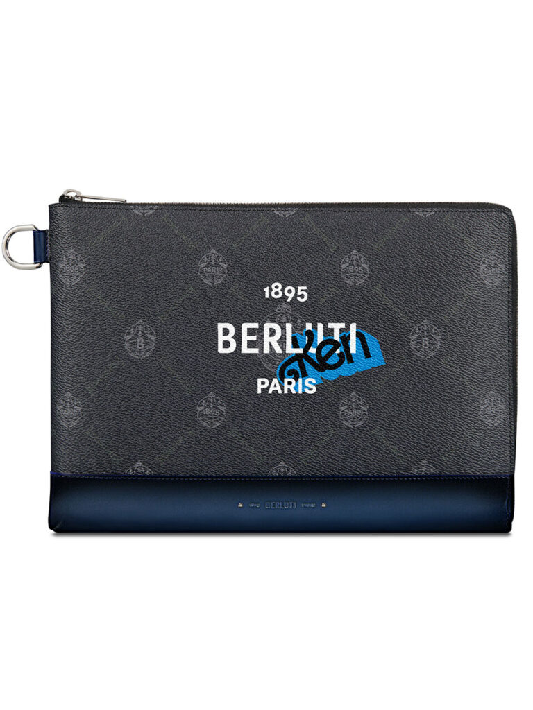 Un T-shirt estampillé des logos entrelacés de Berluti et de Ken, et une pochette Nino… La pièce phare de la maroquinerie Berluti s’affiche cette fois taillée dans la toile Signature, imprimée du logo Berluti — une pochette où se lit aussi le sublime travail du cuir de Berluti autour de détails en cuir Venezia, rehaussé d’une patine California Blue.