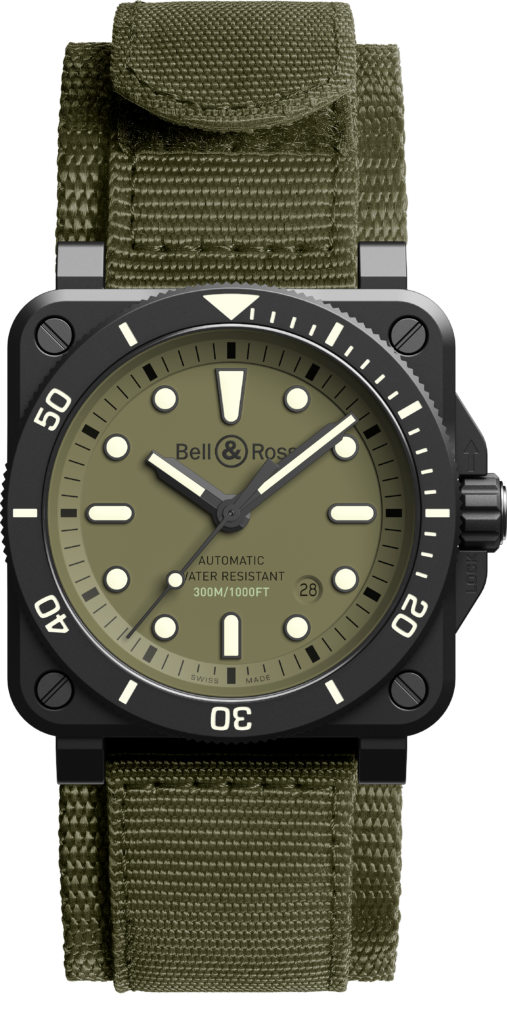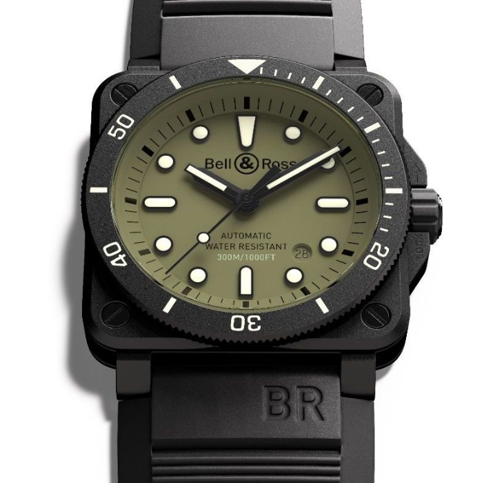 Comme le note Bell & Ross: « Avec sa nuance vert kaki, la BR 03-92 Diver Military reprend la couleur de l’uniforme militaire, de ces hommes pour qui la discrétion est la priorité absolue en mission, et en fait une montre superbement camouflée. »