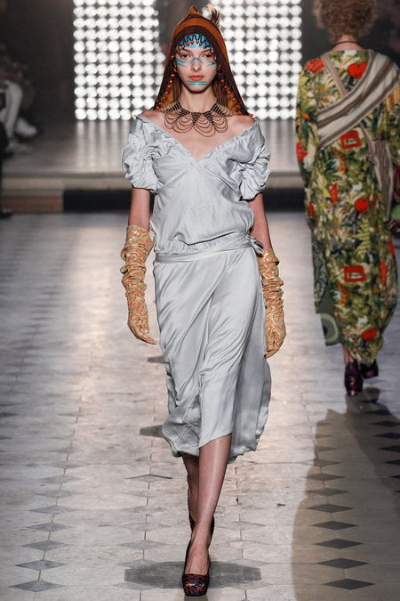 Il paraît évident que Vivienne Westwood s’est inspirée du portefeuille de Charles Frederick Worth, l’homme qui lança la haute couture, au milieu du XIXe siècle pour sa collection Automne/Hiver 2014. Cependant, Vivienne Westwood n’entre pas dans une ligne classique mais donne sa propre touche punk et décalée qu’on lui connaît tant. Elle réussit à entrelacer le musée de la mode avec la passion des imprimés et des couleurs. Elle inclue également à son propos une inspiration venue du Pérou, Westwood restant une fervente environnementaliste. Thème et voie emprunté pour rendre hommage à l’une de ses signatures la robe « déshabillée » : une robe qui tombe négligemment sur ​​les épaules et étreint les hanches magnifiant cette désinvolture si bohème.