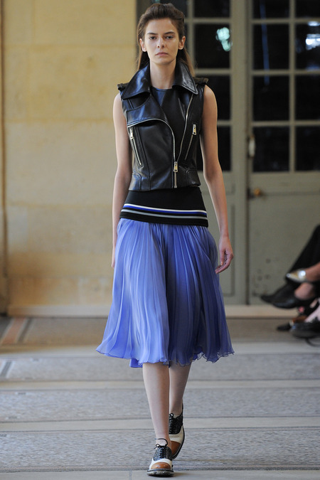 Cette collection présente des silhouettes très urbaines. Plus casual que tout ce que Bouchra Jarrar a pu présenter jusque là, ses perfectos, pièces de prédilection de la créatrice, ne sont pas pour autant moins attirant. On lorgne littéralement sur sa version de l’icône de caractère. En fait, Bouchra Jarrar revisite le perfecto en mode couture ; constellé de cristal vert d’eau par le brodeur Lesage, il s’associe ici à une jupe plissée en mousseline de soie. Et, dans ce dressing à la française, la créatrice fait entrer la sensualité par un doux jeu d’asymétrie.