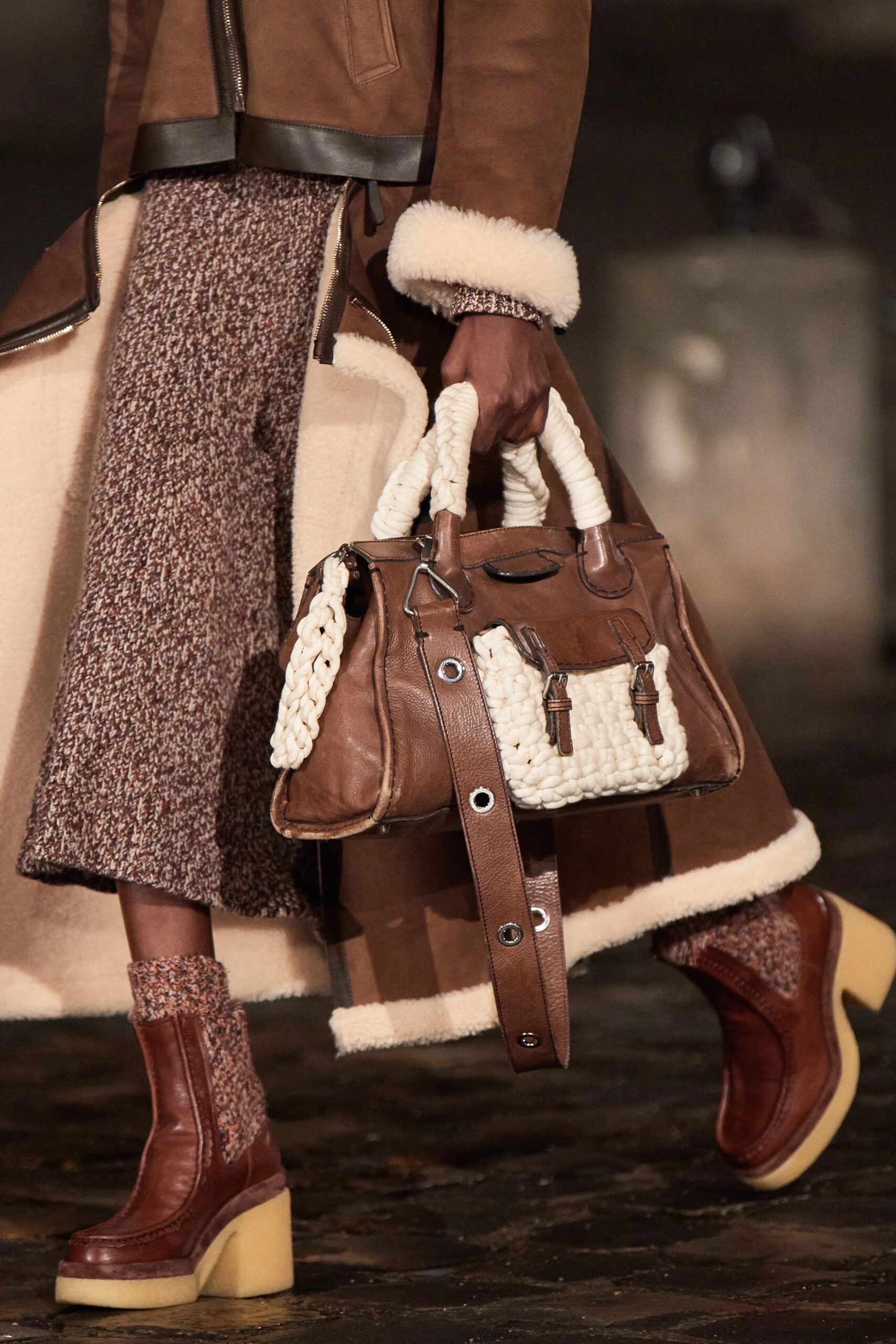 C’est ainsi que le beige iconique de Chloé se trouvait sur des manteaux en sterling enveloppants — manteaux où, ce beige justement était en fait une couleur organique se passant de colorants chimiques. Mieux, ces peaux de mouton retourné et les pièces d’extérieur se taillaient, elles, en cuir écologique.