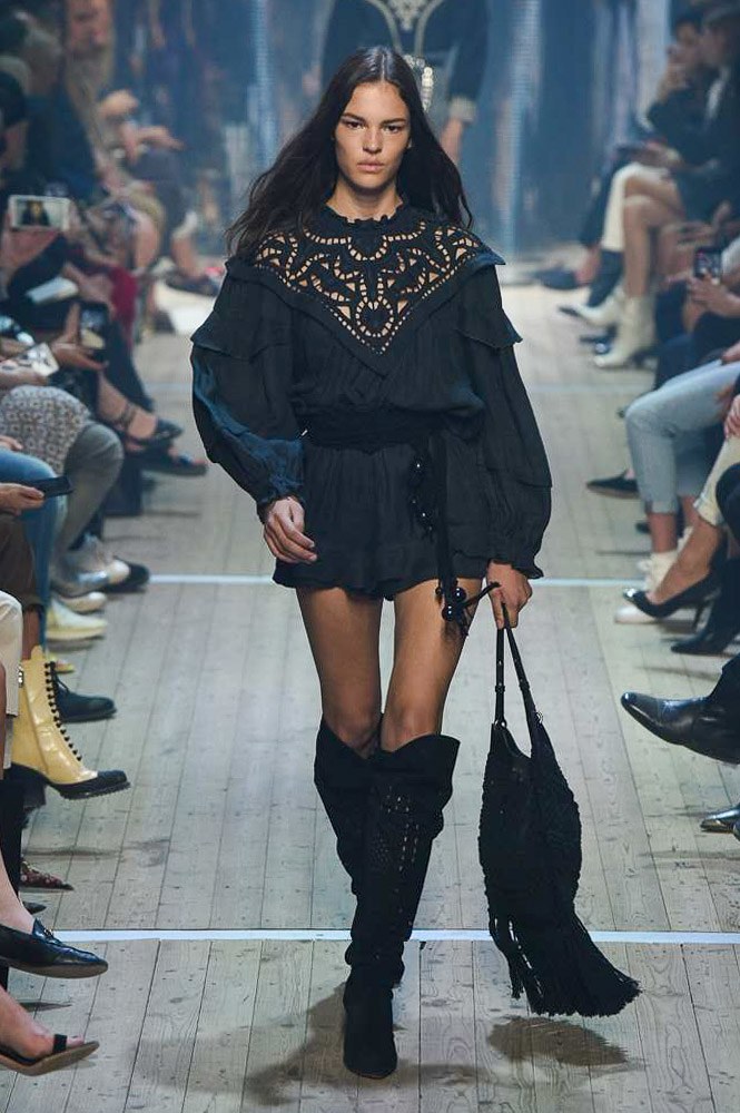 Elle a pratiquement définit la silhouette de la bohème moderne. Pour le Printemps/Eté 2019, Isabel Marant a nourri sa collection d’un fantasme tout fait des tenues de saloon, de disco et des richesses des talents desquels elle s’entoure depuis presque 25 ans. « J’avais envie de faire une collection un peu gaie, fraîche, glamour, mais cool en même temps. » Au coeur du Jardin des Tuileries défilait ainsi un vestiaire entre sequins argents et influences boho. En vedette : une mini-robe aux manches bouffantes et broderies, à la dégaine très marantienne.