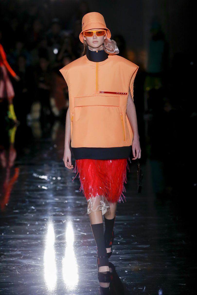 Alors, lorsque sur le podium milanais de l’Automne/Hiver 2018/19, Prada fait défiler nombre de pièces iconiques tout droit issues des archives de cette ligne arrêtée en 2000, on se dit que Miuccia Prada vise juste, encore une fois. Comme un savant mélange entre gimmicks sports et élégance italienne, cette silhouette fait la part belle à la couleur orange — mais version néon. Il faut dire que la collection de la saison prochaine a défilé dans une ambiance très urbaine, presque futuriste. Cette pièce de sport prend ainsi des allures de vêtement spatial et, à travers le Nylon transformé en techno-matière, gagne en pertinence.