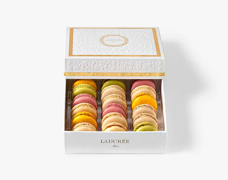 Et ce sont pour dire vrai des créations autour des macarons iconiques qui célèbrent cet évènement — dont ce sapin en édition limitée fait de crème de chocolat blanc Ivoire !