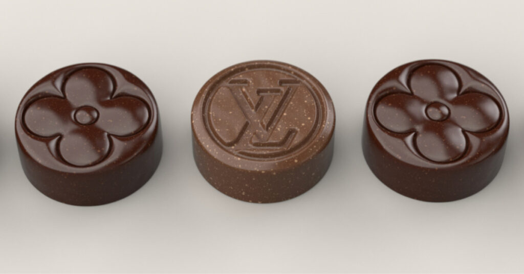 Maxime Frédéric travaille ainsi des tablettes en forme du logo Louis Vuitton, des Guimauves et des bonbons monogames… Dont le chocolat est forcément source de perfection !