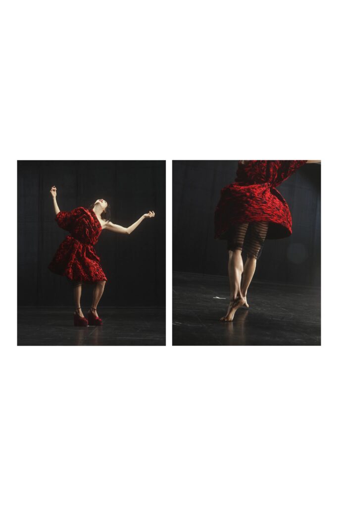 Sur eux, les vêtements Dries Van Noten virevoltaient de leur onctuosité — les imprimés trompe l’oeil faisant se rencontrer l’art de la danse, le corps et le décor. A l’instar des sleep-dress en satin, imprimées en trompe l’œil pour faire écho aux plis des rideaux de scène… Ou encore des robes drapées en soie, des robes aux volants froissés où des impressions photo fantaisistes démontraient la dextérité de la maison Dries Van Noten.