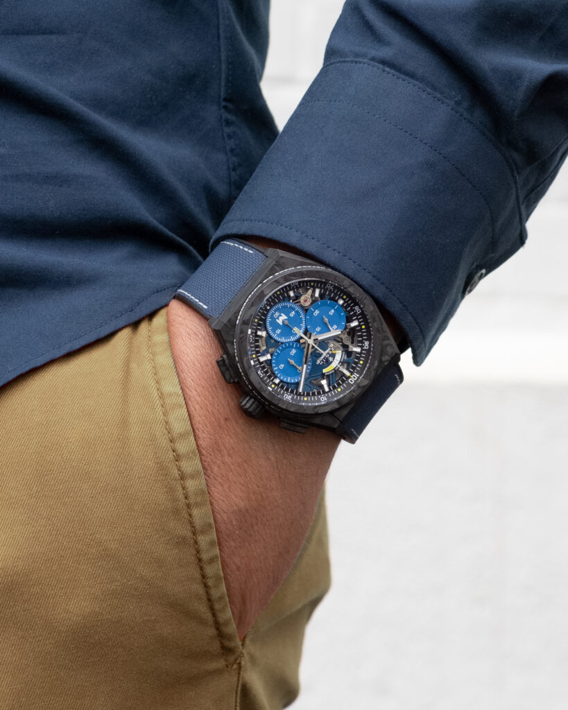 Elégant et sportif, le cadran est encore partiellement ajouré — et les compteurs fermés du chronographe sont traités dans un ton bleu, assorti aux courts de tennis du tournoi Ultimate Tennis Showdown. Des touches de jaune rappellent encore la balle d’un sport qui n’a pas fini de fasciner !