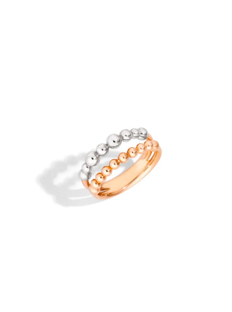 Parmi eux, on remarque ainsi la bague Bollicine à double anneau, l’un en or rose 9K et l’autre en argent. Une association peu conventionnelle là encore de ces précieux métaux, qui ajoute un chic inédit à cette bague. D’autant qu’elle célèbre le mouvement des Bollicine — ce bijou tactile et mobile inspirant l’allégresse.