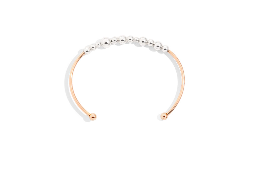Signature que l’on retrouve encore sur le bracelet manchette en titane Bollicine, avec anneau en or rose 9K — une innovation ludique et élégante distillée dans les bulles d’argent de taille irrégulière, tactiles et sensuelles au possible !