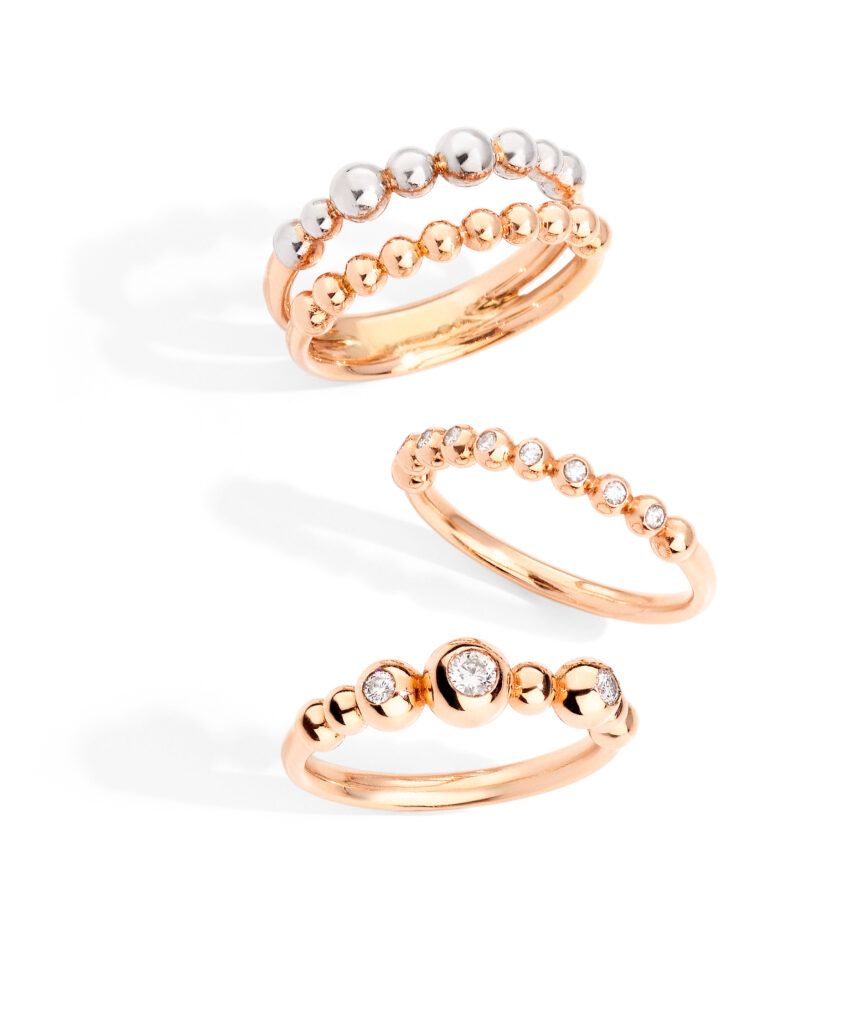 Glissant subtilement sur la peau, sensuelles mais follement désinvoltes — les nouvelles versions des bagues, bracelets, boucles d’oreilles et colliers de la collection Bollicine pétillent à l’unisson. Il faut dire que l’inspiration première de ces bijoux peu habituels a de quoi inspirer la joie et l’allégresse… C’est en effet de leurs designs rappelant les bulles de Champagne que les bijoux Bollicine tirent toute leur irrévérence.