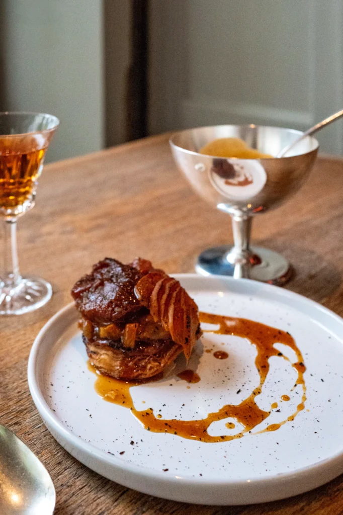 Aujourd’hui, l’esprit du lieu, sous la coupe du nouveau propriétaire Arnaud Duhem, se traduit dans une cuisine lisible mais ambitieuse, qui assume pleinement la saisonnalité et la noblesse du produit. Le ris de veau rôti, servi avec sabayon et langues d’oursins, accompagné d’une purée de pommes de terre fumée, s’impose comme l’un des plats les plus marquants de la carte. Un plat de maturité, précis, sans effets inutiles.