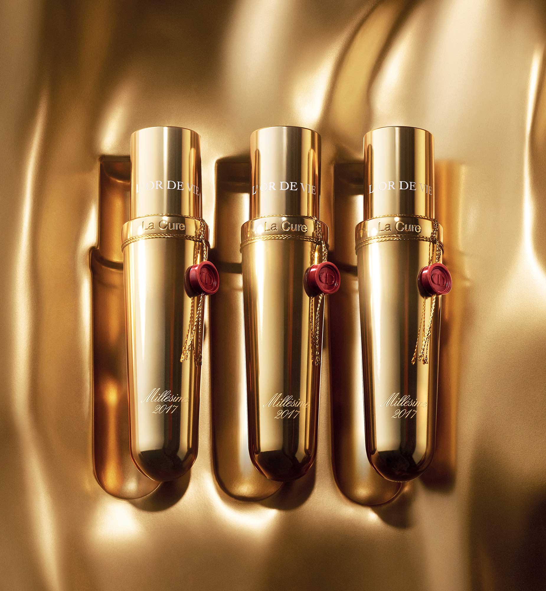 L’Or de Vie lègue ainsi cette quête d’excellence aux femmes Dior — ses pouvoirs transformatifs et inédits… En trois mois, semaine après semaine, la peau développe une résistance remarquable. Et c’est en réactivant pleinement la jeunesse que les contours du visage sont comme resculptés, protégés par cette cure miracle. Mais la cure est rare et précieuse. L’Or de Vie se concentre dans trois flacons scellés de fil d’or et cachetés de cire rouge — et seules 1800 pièces contenant cette formule surdouée ont pu être produites dans les ateliers Dior du 30 de l’Avenue Montaigne.