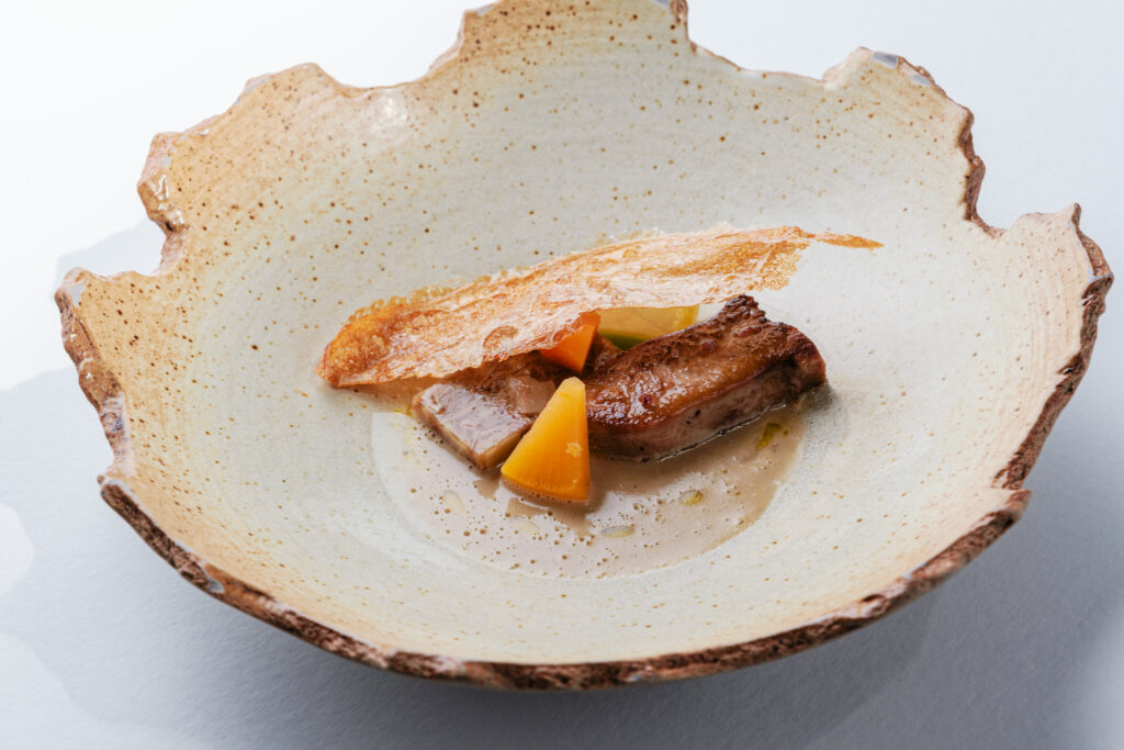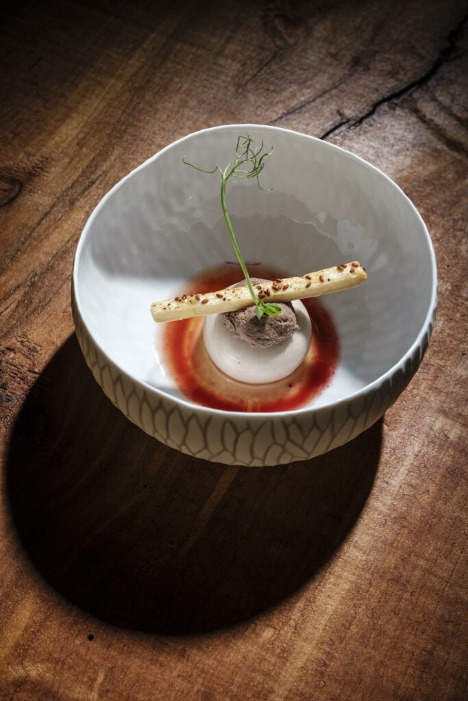 Pas de carte figée. Des menus en plusieurs séquences, qui évoluent selon les saisons, les rencontres, l’intuition du moment. Chaque plat raconte un produit, un geste, une intention. Une mousseline de crottin de Chavignol, un jus végétal réduit avec précision, une émulsion discrète autour d’un bouillon de champignon… rien n’est surjoué. La technique est maîtrisée mais jamais démonstrative. Les assiettes sont nettes, équilibrées, profondément ancrées dans le terroir mais sans jamais tomber dans la caricature du “local”.