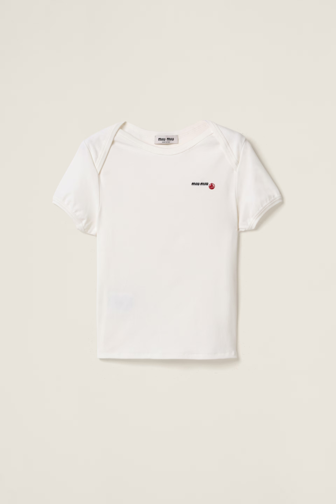« L’idée était de revenir à des vêtements simples, mais essentiels, en leur donnant cette touche de luxe discrète qui définit Miu Miu », explique un porte-parole de la maison. Cette collaboration célèbre ainsi l’art du minimalisme efficace : aucun détail superflu, mais des finitions soigneusement travaillées. Le jersey blanc s’orne de bords en picot, tandis que les logos brodés, presque naïfs, rappellent les vêtements d’enfance.