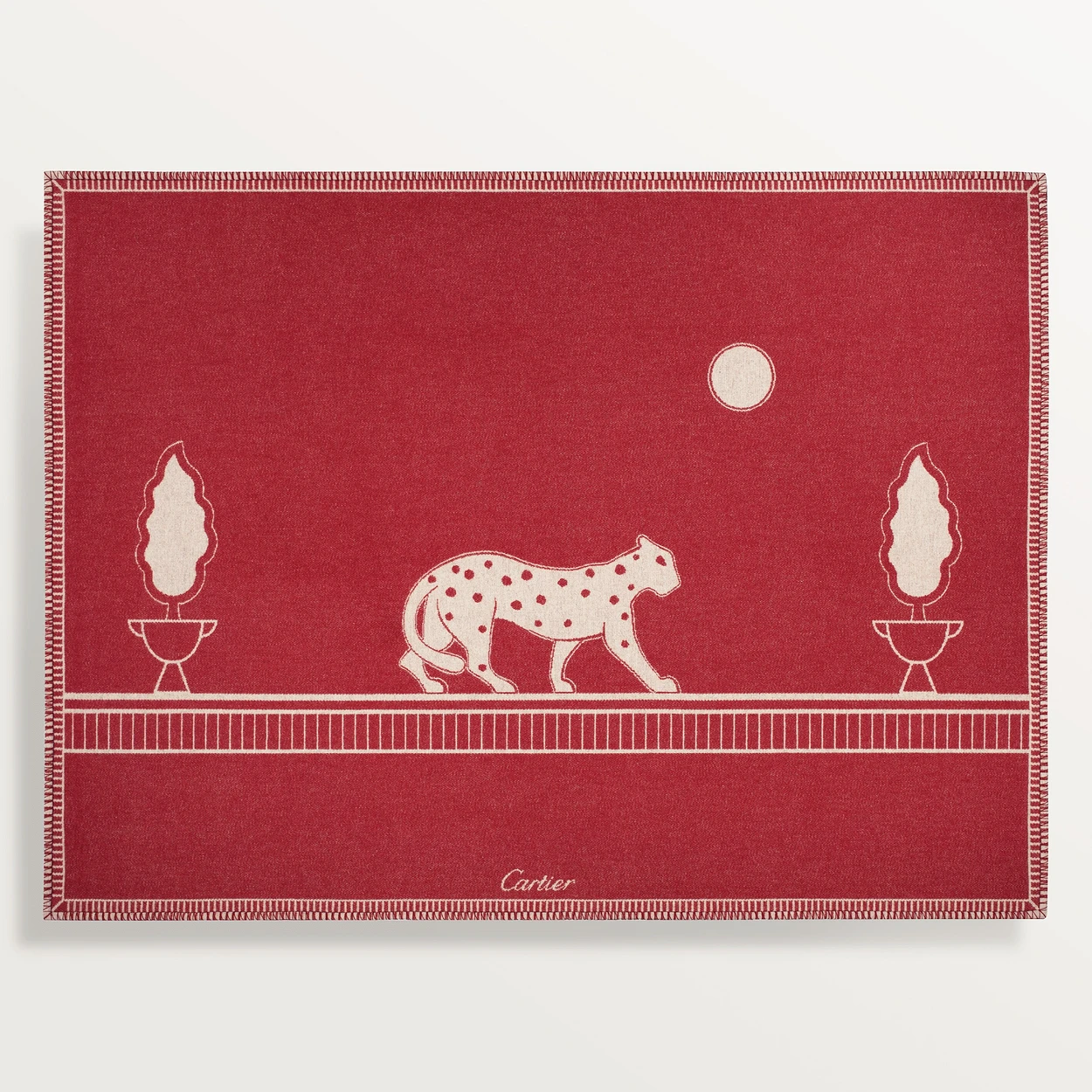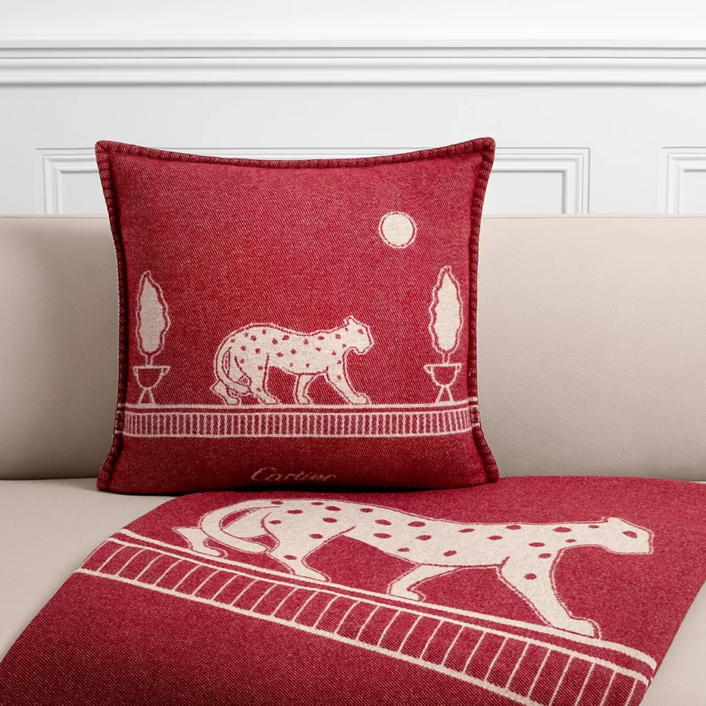 Autre style, autres codes — la maison Cartier imprime son animal-totem, la panthère, sur un plaid en cachemire des plus parisiens. En laine mérinos et cachemire, ses finitions à la main et sa couleur rouge amène à l’intérieur de la maison les codes iconiques de Cartier…