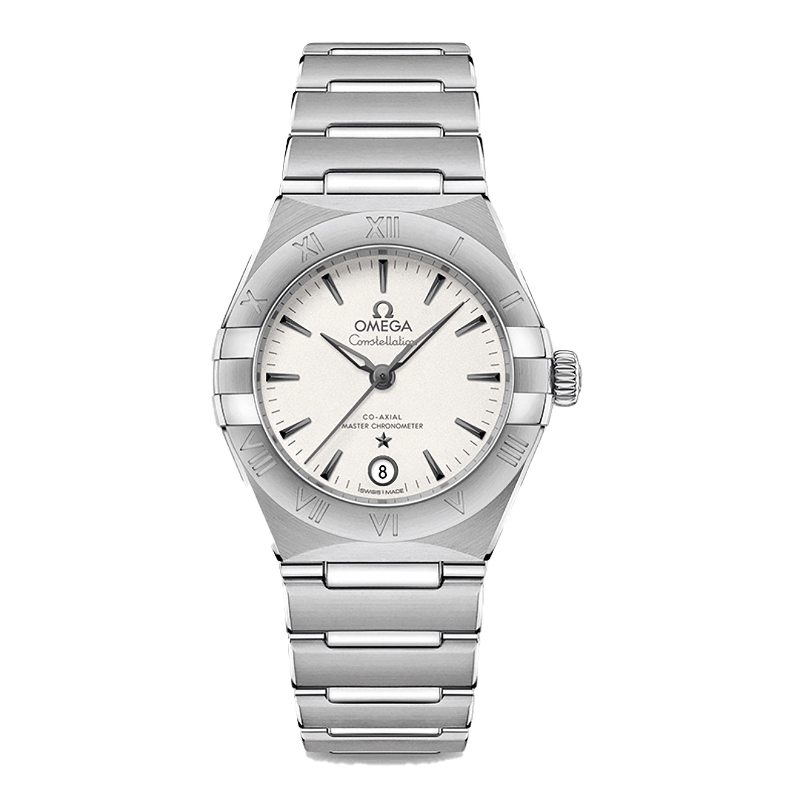 Description : L’esthétique reconnaissable et intemporelle de la collection OMEGA Constellation se caractérise par ses fameuses demi-lunes, la présence des célèbres « griffes » sur la lunette et son bracelet mono-rang. Ce modèle en acier inoxydable de 29 mm arbore une lunette gravée de chiffres romains, un cadran blanc cristal argenté et un guichet de date à 6 heures. Les aiguilles, le logo OMEGA, l’étoile Constellation et les index, de couleur noire, offrent un superbe contraste avec le cadran blanc.