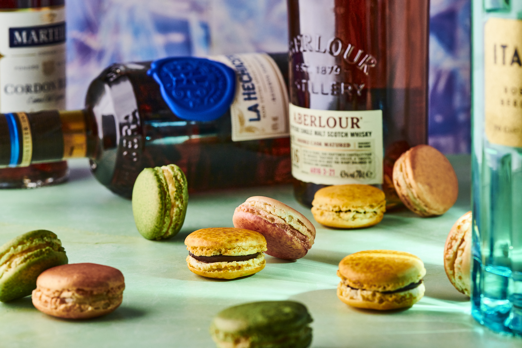 Quatre recettes, quatre parfums de macarons donc… Le Scintillant or Macaron chocolat 62% Brésil et Cognac Martell Cordon Bleu. Le Scintillant rubis Macaron Whisky Aberlour 16 ans façon straccitella. Le Scintillant bronze Macaron Rhum La Hechicera aux épices douces. Le Scintillant vert Macaron agrumes et Italicus et pointe de gingembre.